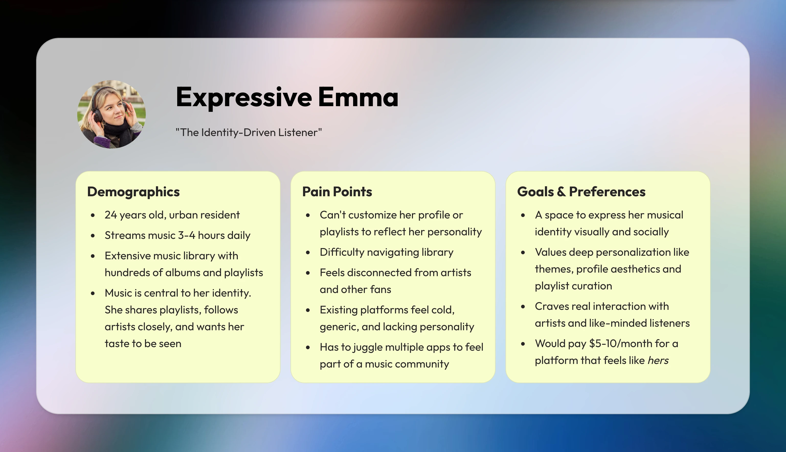 To understand the motivations behind a personalized music experience to find community, I identified the three core jobs our persona is trying to accomplish: